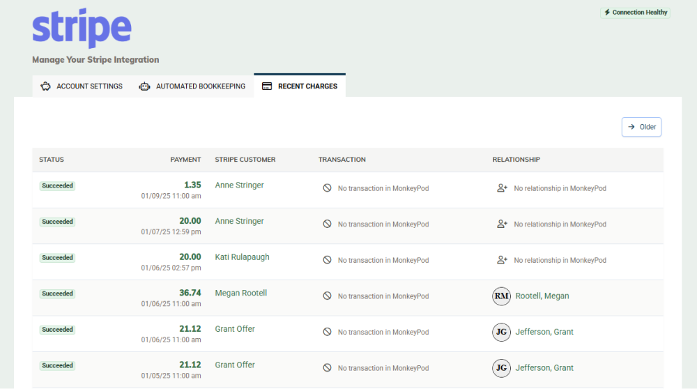 But there’s always room for improvement, and this month, we did just that. Now, you can see a list of all your Stripe sales right from MonkeyPod. And if for some reason the transaction is missing in MonkeyPod, you can record it in just a couple clicks.