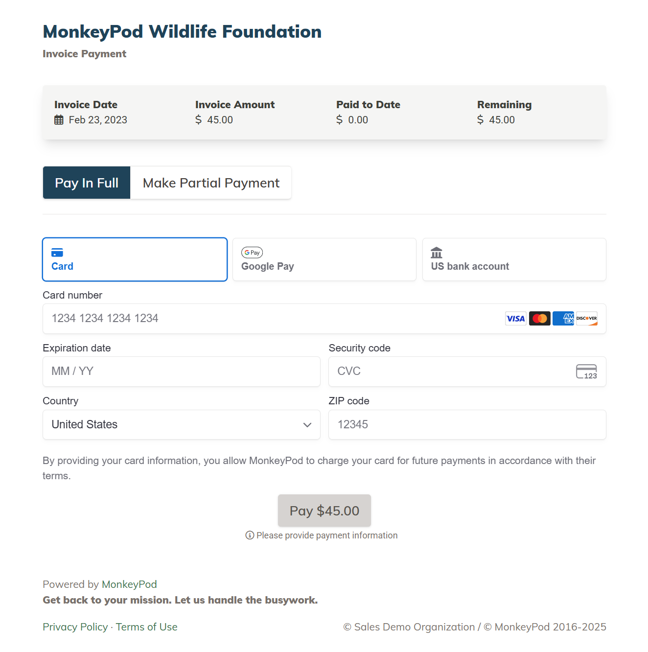These options were recently made available on Fundraising Pages, but now we've brought the fun to invoices as well. Your donation embeds can accept payment via ACH as well.