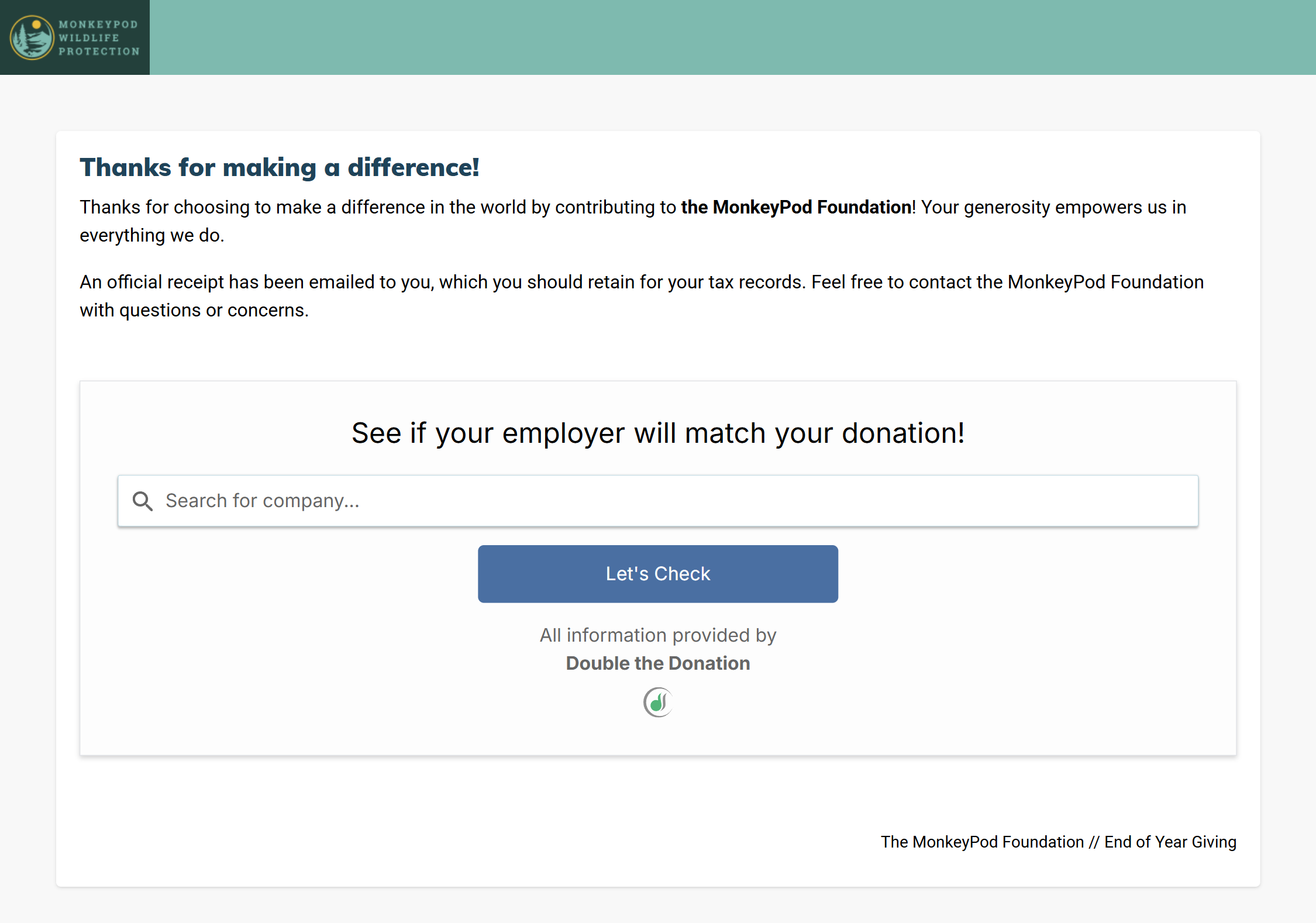 The moment of greatest engagement is when a donor is already on your fundraising page and has their credit card in hand. If they have to leave your site to search for their company's policy on a separate portal, you risk losing the donation entirely due to "click fatigue." By embedding a fundraising tool like Double the Donation directly into your MonkeyPod fundraising pages, you let supporters check their eligibility in real time without ever breaking their momentum.